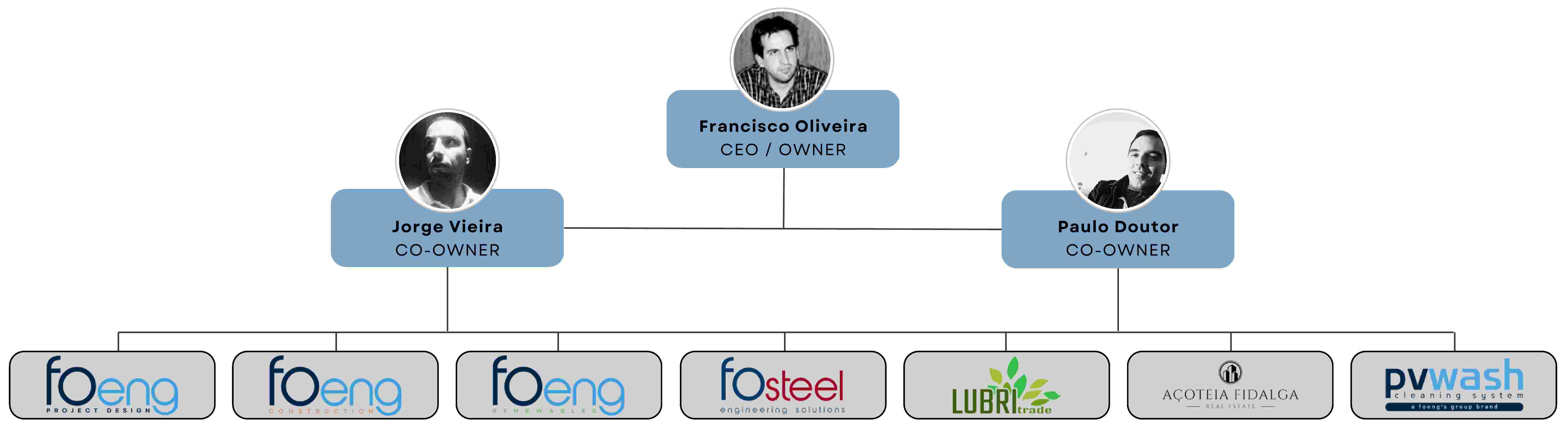 A FOeng Group é liderada pela administração, que está presente em todas as vertentes de trabalho das empresas do grupo, permitindo assim uma gestão direta de todas as tarefas que ocorrem. Contamos com profissionais experientes para coordenar as diferentes áreas e empresas existentes. Possuímos uma estrutura organizacional que assegura eficiência e um acompanhamento direto em todas as fases do trabalho.